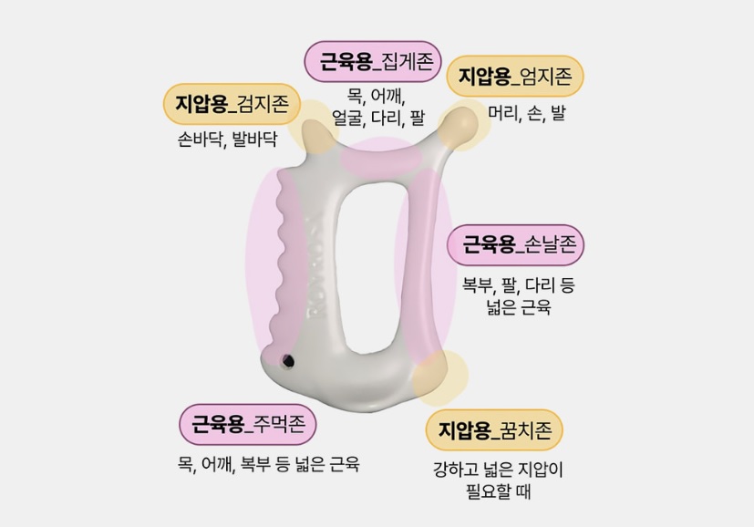 전문가의 손을 본떠 만든 인체공학적 디자인 이로써 검지존은 세밀하게 지압을 해주고 엄지존은 강한 지압, 주먹존은 넓은 자극을 주고 손날존은 근육을 쓸어내려 줍니다.